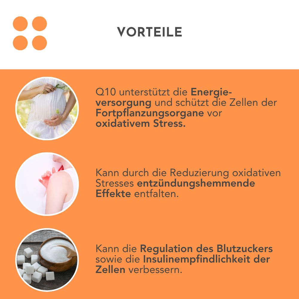 Coenzym Q10, in seiner bioaktivsten Form als Kaneka Ubiquinol®, spielt eine entscheidende Rolle bei der Energieproduktion in unseren Zellen. Es ist nicht nur von Vorteil für die Eizell- und Spermienqualität, sondern unterstützt auch den allgemeinen zellulären Energiestoffwechsel, was insbesondere bei Zuständen wie PCOS von Bedeutung sein kann.