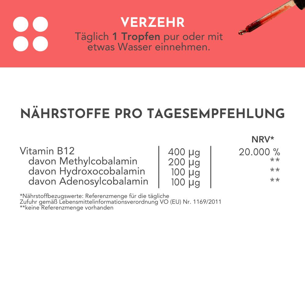 Täglich 1 Tropfen mit 200 ml Wasser mithilfe der Pipette konsumieren, oder wie vom Arzt empfohlen. Die Tagesdosis von 1 Tropfen entspricht 400μg Vitamin B12.